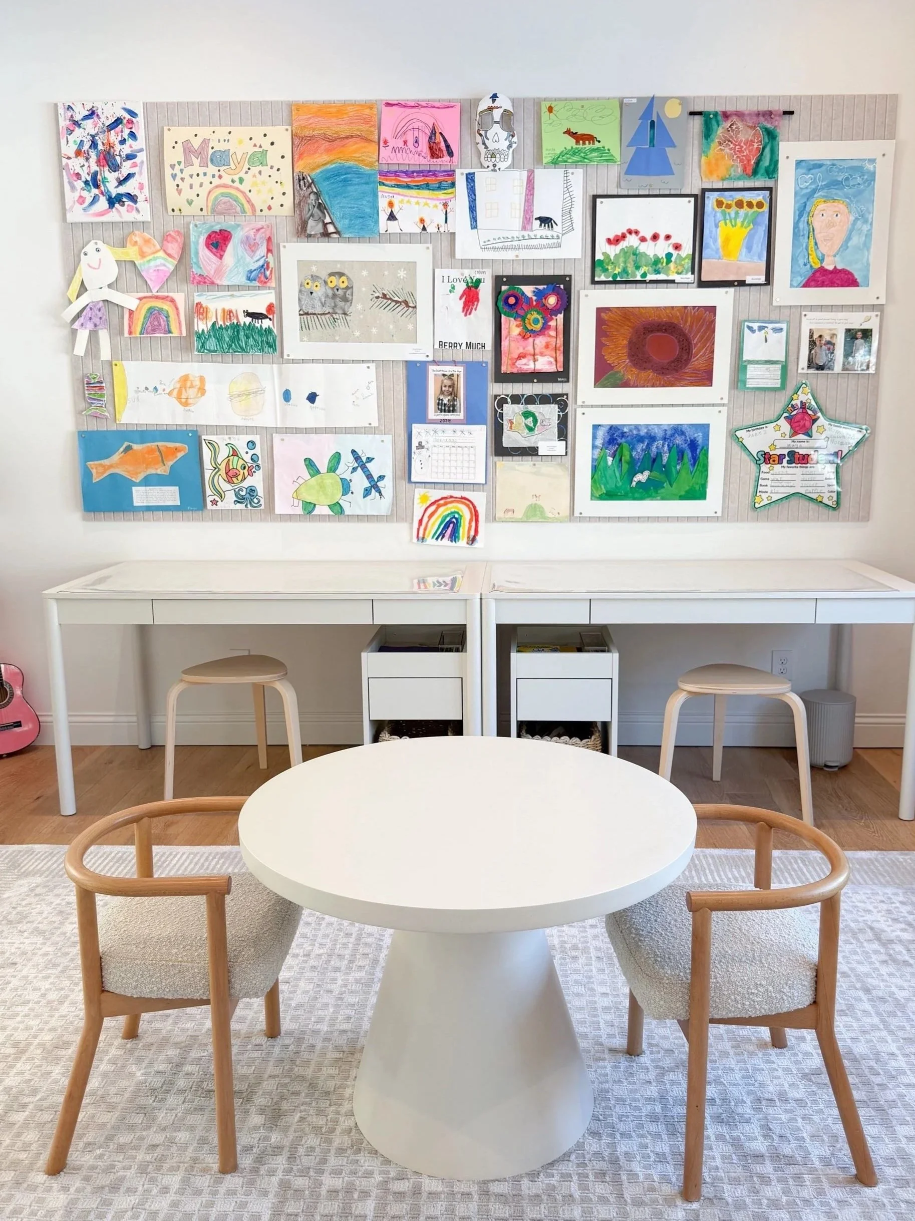 Craft zone with crayons, paper, and supplies